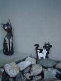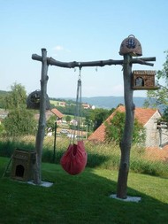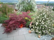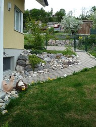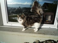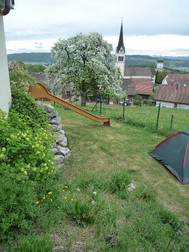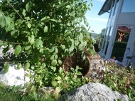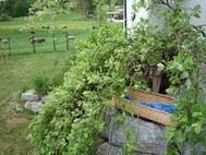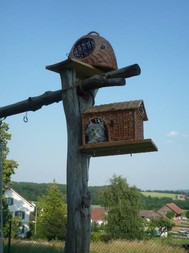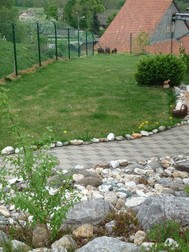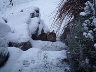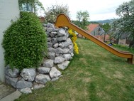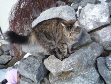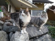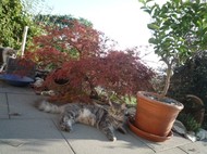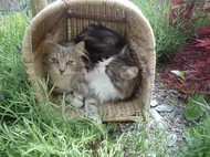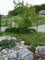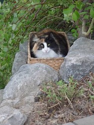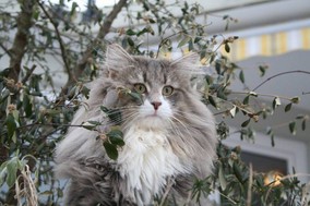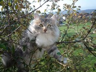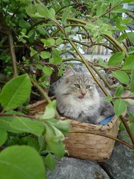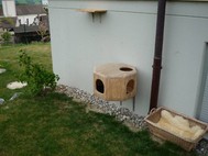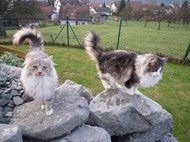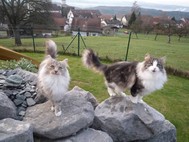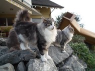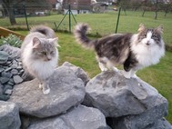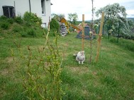 Unser ganzes, grosses Grundstück ist rundherum katzensicher eingezäunt, was es allen Samtpfoten erlaubt, nicht nur auf der Terrasse, sondern auch in der Aussenanlage herumzudüsen. Liegeplätze an der Sonne, Bäumchen, Büsche, Katzen- und Kinderspielhaus, Kuschelhöhlen, Naturkletterbäume, Heukörbchen, Steine, Kletter- und Liegebretter... und jede Menge anderer Dinge machen das Leben draussen interessant und abwechslungsreich. Da geht die Post ab!